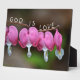 Cette plaque photographique présente de jolies fleurs de coeur roses qui saignent avec le beau message que Dieu est amour. Ces plaques sont de haute qualité avec de vraies couleurs et une finition brillante.