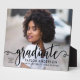 Élégant et élégant panneau de graduation avec chevalet comporte une photo de haut niveau avec une superposition de script noir "diplômé". Personnalisez le texte personnalisé moderne avec le nom de votre élève, l'école et l'année de classe. Fait un beau gardien à afficher dans votre maison!