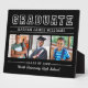 Plaque de graduation photo classique 3 avec chevalet - caractéristiques Graduate en caractères serif gras avec texte personnalisé moderne qui peut être entièrement customisé avec le nom complet du diplômé, l'année de classe et le nom de l'école. Ajoutez trois images préférées du diplômé aux images de l'espace réservé carré. La couleur noire de l'arrière - plan peut être modifiée.