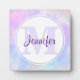 Une plaque photo avec un beau motif abstrait. Le violet, le rose et le blues mélangent, mélangent et coulent ensemble pour créer un design abstrait d'aquarelle élégant et magnifique. Un cercle blanc superposé avec votre nom et votre monogramme initial à l'intérieur.