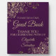 Cet élégant panneau ou plaque d'auto invitera les clients à signer votre livre d'or mariage. Il présente un design simple, sophistiqué mais soigné avec du texte doré sur un arrière - plan prune violet profond avec une fausse feuille d'or frilly floral filigree dans les coins.
