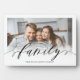 Le parfait souvenir spécial photo de famille pièce d'accent maison pour capturer vos familles souvenirs spéciaux. La plaque photo familiale minimale moderne comprend un grand plan de photo unique pour afficher votre photo de famille avec une superposition "famille" dans une typographie de script de brosse noire, cadre blanc propre avec nom de famille personnalisé.