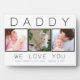 Ajoutez vos photos et votre message de Fête des pères à cette jolie plaque photo personnalisée "Daddy We Love You". Un espace pour 3 images et un espace pour customiser avec vos noms en bas. Le texte est défini dans une police de caractères moderne en noir et bleu doux. Convient pour la Fête des pères, les anniversaires ou Noël.