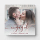 Commemorate your engagement with this beautiful modern keepsake plaque. The burgundy red text reads "Our first Christmas engaged," with the word "engaged" in elegant handwriting script with flourishes before and after. Replace the sample image with your favorite photo, and add your names and the year. A white gradient filter helps make the text pop.