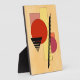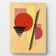 Un triangle noir divisé en segments, une bande trapézoïdale noire divisée en deux, un cercle rouge, un rectangle jaune, un carré rouge pâle, un cercle pourpre, et un carré orange sont des éléments de cet art abstrait de formes imbriquées par Richard H. Fay.