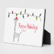 Illustration de girafe dessinée à la main avec chapeau de Père Noël rouge, chaîne de lumières de vacances et texte personnalisable "Joyeuses Fêtes"