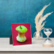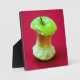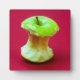 Photo of a big green apple against red background. The apple is eaten out, only the core is left.