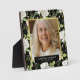 Plaque photo carrée de célébration de vie avec un fond noir élégant, des fleurs botaniques blanches élégantes, une photo de votre proche dans un cadre doré faux, leur nom et dates de naissance et de décès.