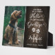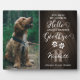 Plaque commémorative de perte d'animal avec un fond en bois rustique, l'initiale et le nom de votre chien, une photo de votre chien ou chat, des empreintes de patte de cœur, et une citation de sympathie qui se lit 'vous étiez mon bonjour préféré, et mon au revoir le plus difficile'.