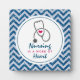 Plaque photo avec un motif en faux parties scintillant de chevron bleu. Pas de parties scintillant réelle, juste une image. En haut, un cadre blanc et à l'intérieur, le dicton : L'allaitement est une oeuvre de coeur, avec un petit coeur rouge et un stéthoscope gris.