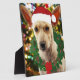 Un tableau d'art numérique d'un jeune chiot prêt pour Noël avec une couronne, un chapeau de Père Noël et un arbre décoré.