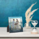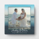 Plaque photo-cadre permanente qui est faite à dernier. L'eau bleue de l'océan et le ciel forment l'arrière - plan pour encadrer une grande photo d'un couple le jour de leur mariage. Les noms sont ajoutés sous l'image dans un script élégant et pivotant. Une autre ligne de texte imprimé peut contenir la date et le lieu de la cérémonie.