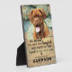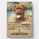 Plaque commémorative de compagnie personnalisée avec une photo de votre animal de compagnie bien-aimé dans un cadre légèrement effacé, un fond en bois rustique de campagne, et une citation de sympathie qui dit "vous avez souri avec vos yeux, ri avec votre queue et aimé de tout votre cœur", une empreinte de patte, un cœur, le nom de votre chien et les dates. Un beau souvenir et un hommage à votre précieux animal de compagnie, chien ou chat de la famille.