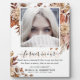 Une belle plaque photo commémorative botanique automnale pour que vous puissiez l'exposer avec amour et fierté dans votre maison. Le design élégant présente une photo personnalisée de votre proche (Conseil photo : recadrez et redimensionnez l'image en vous assurant que le sujet est au milieu avant de la télécharger), des florales aquarelles automnales et un feuillage botanique rustique. Le texte est une combinaison de calligraphie et de polices cursives, qui peuvent toutes être facilement personnalisées. La citation de condoléances se lit comme suit : "La mort laisse un chagrin que personne ne peut guérir, l'amour laisse un souvenir que personne ne peut voler".
