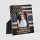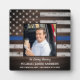 Honorez votre policier aimé avec cette plaque photo de mémorial de police de la ligne bleue mince dans un drapeau américain en bois rustique dans un motif de couleurs de drapeau de police. Personnalisez avec la photo, le nom et les dates de votre policier. Cette plaque de mémorial de police de la ligne bleue mince sera un souvenir précieux pour honorer un policier tombé ou un agent des forces de l'ordre. COPYRIGHT © 2020 Judy Burrows, Black Dog Art - Tous droits réservés. Plaque de mémorial de police en souvenir affectueux de la ligne bleue mince.