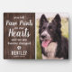Plaque commémorative personnalisée pour animaux de compagnie avec une photo de votre animal de compagnie bien-aimé, un fond en bois rustique et une citation de sympathie qui dit "vous avez laissé des empreintes de pattes sur nos cœurs et nous sommes à jamais changés", une empreinte de patte, un cœur, le nom de votre chien et les dates. Un merveilleux souvenir et un hommage à votre précieux animal de compagnie familial chien ou chat.