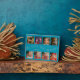 Modern and minimal keepsake photo plaque to gift it to a grandmother featuring 8 photos with a curvy typography text that says "we love you grandma." The color is aqua blue.