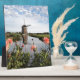 Plaque d'un moulin à vent et d'un canal avec des fleurs de dahlia roses dans un paysage en Hollande.