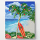 Bonnes fêtes des plages sablonneuses chaudes de votre plage tropicale préférée d'île. Palmier décoré des ornements et des lumières de Noël, avec une rétro planche de surf se penchant contre l'arbre de Noël.