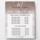 Salon de SPA de maquillage de cheveux marbré violet Prix Menu Plaque. Spa de maquillage de cheveux Salon Premier Menu, violet, éclat, marbré avec logo monogramme. Il a un script élégant dans une élégante couleur violet foncé. Idéal pour la pandémie de coronavirus COVID-19 pour une façon sans contact de montrer vos services et prix. Personnalisez ce design personnalisé avec vos propres informations et le logo monogramme de marque d'entreprise. Veuillez me contacter pour toute aide dont vous pourriez avoir besoin, ou pour toute question que vous pourriez avoir.