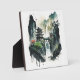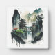 Une belle plaque montrant une illustration manuscrite d'un paysage à l'architecture chinoise ancienne et aux cascades majestueuses.