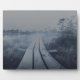 Peinture de brouillard sur la tourbière avec chemin en bois, petits étangs et pins. sentier randonnée avec passerelle en bois qui traverse la mare.