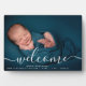 Photo personnalisée Collage de bienvenue Script Overlay La plaque de bébé est une façon moderne et cool de se souvenir de l'arrivée du nouvel ajout à votre famille. Il convient aussi bien aux filles qu'aux garçons. Le devant a une grande photo avec le texte d'accueil dans le script blanc et le nom du bébé et le modèle des statistiques de naissance.