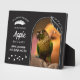 Garder en mémoire votre oiseau de compagnie bien-aimé pour toujours avec cette plaque photo imprimée avec une photo de votre oiseau de compagnie à l'intérieur d'un cadre en forme d'arche orné d'une plume. Ajoutez le nom de votre oiseau dans un script blanc moderne, leur année de naissance et année de disparition, et une citation réconfortante et inspirante au-dessus d'une volée d'oiseaux volant haut et libre.