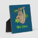 Un joli dessin d'un paresseux brun accroché à une branche avec des feuilles, accroché à l'envers. Les mots ralentissent écrit en dessous dans une police de grunge vert citron cool.