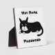 Chat noir mignon avec texte affichant un rappel de votre nom de réseau wifi et mot de passe.