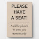 Ce design élégant et respectable comprend le message "S'IL VOUS PLAÎT UN SIÈGE!", ainsi que le message "Je serai heureux de vous servir momentanément". Cela pourrait être utilisé dans une salle d'attente ou un coin salon pour informer les patients ou les clients qu'ils seront aidés sous peu et qu'entre-temps ils devraient avoir un siège de salle d'attente.