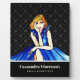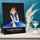 Conçue d'après mon illustration d'une belle dame aux cheveux blonds portant une robe de cocktail bleu roi foncé classique élégante avec un motif damassé noir et gris sur le fond. Le design comporte des textes personnalisables sur le côté droit. Personnalisez-le dans ma boutique pour un design personnalisé.
