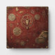 Un emblème orné brille en or sur un fond cramoisi texturé, entouré de symboles ésotériques et d'inscriptions cryptiques.