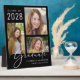 Élégante plaque de graduation noire présentant un collage photo de 3 et "Graduate" dans un script blanc élégant. Ajoutez le nom du diplômé, l'année de classe et l'école ou l'université dans la typographie blanche moderne.