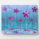 Dessin numérique de jolies fleurs violettes stylisées aux centres rouges brillants. Ils vous regardent tranquillement depuis la haute herbe à côté d'une piscine d'eau claire qui ondule.