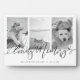 Chérissez vos souvenirs spéciaux avec notre plaque de mémorial de collage photo d'animal de compagnie moderne et minimaliste. Notre plaque de mémorial de photo d'animal de compagnie vous permet d'afficher 3 de vos souvenirs de photos d'animaux de compagnie préférés pour les chérir chez vous. "Souvenir Affectueux" est affiché dans une calligraphie moderne de pinceau noir. Personnalisez avec le nom de votre animal de compagnie, des photos et la date passée.