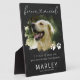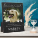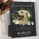 Élégante plaque photo mémorial animal de compagnie avec un fond ardoise fausse rustique, une photo de votre chien ou chat, des empreintes de pattes, la phrase 'à jamais regretté' qui intègre un cœur, leur nom, dates de naissance et de décès, et la phrase de sympathie 'si j'avais pu te sauver, tu aurais vécu pour toujours'.