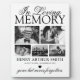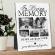Plaque commémorative avec un fond blanc croquant, 5 photos de votre être cher disparu, le texte "en souvenir affectueux", leur nom, dates de naissance et de décès, un cœur noir et la phrase de souvenir "parti mais jamais oublié".
