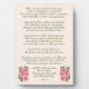 Cette plaque de table (pour la perte d'un animal de compagnie ou d'une personne) présente de délicates fleurs roses avec des feuilles vertes sur un fond rose clair et un poème commémoratif d'un auteur inconnu pour aider ceux qui sont dans le deuil : Quand je serai parti, libère-moi, laisse-moi partir. J'ai tant de choses à voir et à faire, Tu ne dois pas t'attacher à moi avec trop de larmes, Mais sois reconnaissant pour les nombreuses bonnes années que nous avons eues. Je t'ai donné mon amour, et tu ne peux que deviner Combien tu m'as donné de bonheur. Je te remercie pour l'amour que tu m'as montré, Mais maintenant, il est temps que je poursuive mon chemin seul. Alors pleure un peu sur moi, si tu le dois, Puis laisse ta peine être consolée par la confiance. C'est seulement pour un temps que nous devons nous séparer, Alors garde précieusement les souvenirs dans ton cœur. Je ne serai pas loin, car la vie continue. Et si tu as besoin de moi, appelle et je viendrai. Même si tu ne peux me voir