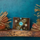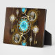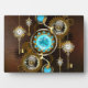 Turquoise lenses with antique watch with brass gears and golden keys on rusty, brown background. Steampunk style.