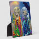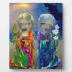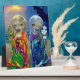 "Enfant Soleil et Enfant Lune" - un de mes tableaux préférés à ce jour, j'adore les couleurs dans celui-ci. Inspirées par la chanson "Moonchild" du roi Crimson - ces soeurs se tiennent ensemble, mais séparément - représentant le soleil (à votre gauche) et la lune (à votre droite). Le ciel et la mer sont tous deux représentés ici reflétant la dichotomie jour/nuit. L'Enfant Soleil est en train d'écraser un calice tenant la lumière du soleil, et l'Enfant Lune porte un vaisseau contenant la lune croissant. Un coq représente jour/matin, et le lapin-lune est pour la nuit. C'est un morceau que j'ai lancé et vendu à Dragon*Con 2011 - à l'origine il était dans un cadre de retable de diptyque vraiment soigné (à deux panneaux) que mon mari Matt a fait pour moi. Même si l'original a été vendu, j'ai des tirages et d'autres marchandises avec ces beautés! Ma propre peinture acrylique originale.