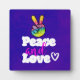 Plaque cool funky avec paix et amour écrit dans une police de typographie super. L'illustration est un symbole de paix en forme de main, les doigts soulevés dans le signe v classique, tous faits en couleurs arc-en-ciel. Un petit coeur de gribouillis à côté du mot amour. Design super psychédélique. Arrière - plan violet acide.