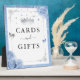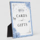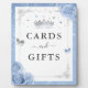 Créez vos propres affiches uniques et élégantes pour les cartes, les cadeaux et les voeux qui s'ajoutent bien à un thème de fête bleu et argent bébé. L'aquarelle florale de Raphaela Wilson met en valeur des roses bleu clair accentués d'un faux argent métallique. Une couronne princesse royale/tiara orne le sommet avec des confettis aux papillons étincelants à la parties scintillant, et une bordure en fibre vintage qui borde le design du conte de fées. Ces panneaux de temps simples, une fois sur une montre comprennent un stand pour un placement simple de table. Ils peuvent être facilement personnalisés avec votre propre texte personnalisé, et n'hésitez pas à changer la calligraphie de script et la typographie moderne si vous préférez des polices alternatives. Utilisez ces panneaux de dessus de table do-it-yourself modèle pour les mariages de Cendrillon, un baby shower princesse, douche d'hiver merveilleland nuptiale, bébé bleu doux 16 anniversaire / quinceanera, ou autres occasions spéciales. Ils peuvent être placés sur la table juste à côté de votre boîte cadeau, et les clients arrivants sauront où placer leurs cartes. Grandes ou petites, les dimensions de ces jolies affiches de table 8x10 sont réglables. Catégorie : Symboles de mariage élégants pour cartes et cadeaux avec papillons; Cartes d'aquarelle fleurie et signes de cadeaux avec piédestal; et mariage bleu bébé / faveurs. Bébé bleu et argenté couleurs de fête : bleu pastel poussiéreux, argent, gris clair, gris foncé et blanc.
