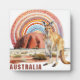 La plaque de la tablette carré d'Art numérique présente une variété d'éléments australiens générés par l'IA, dont Uluru (Ayers Rock) au loin, un kangourou et un soleil fait à partir d'oeuvres d'art aborigènes à points.