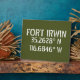 Coordonnées de la carte de latitude et longitude pour Fort Irwin - situé dans le désert près de Barstow, en Californie police blanche de style sercil sur l'arrière - plan vert de l'armée.
