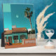 Une photo colorée d'une ville espagnole avec un bâtiment traditionnel, un croissant de lune et un palmier. Valence, Alicante.