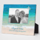 Nouveau cadeau photo avec arrière - plan de mer tropicale. Cette plaque permanente de 8x10 pouces fera imprimer la photo du couple pour préserver les souvenirs. Deux minuscules étoiles de mer blanches / étoiles de mer décorent le coin supérieur du cadre mince et linéaire. Téléchargez une image d'orientation horizontale (paysage) à partir du mariage et customisez trois lignes de texte bleu marine en dessous. L'exemple de texte a la date du mariage, les noms de la mariée et du marié, avec une ligne pour un dicton ou vers. L'exemple de libellé est : "Avoir et tenir à partir de ce jour." L'eau et le surf turquoise de l'océan au bord du sable est l'image arrière - plan. Pour en savoir plus sur ce produit, lisez la description ci-dessous.