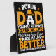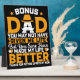 Un hommage sincère à l'incroyable lien entre un père bonus et son enfant. Cette conception reconnaît magnifiquement le rôle d'un beau-père avec un message plein de gratitude, d'amour et d'humour. Avec une typographie audacieuse en blanc et orange, les mots "BONUS DAD" se démarquent fièrement, associés à une moustache et un graphisme casquette qui incarne la sagesse et la force paternelle. Les mots touchants appréciation de l'express : "Vous ne m'avez peut-être pas donné la vie, mais vous avez certainement rendu ma vie meilleure. Merci d'avoir supporté ma mère." Les petits coeurs et les étoiles rehaussent subtilement la profondeur émotionnelle, ce qui en fait la façon parfaite d’honorer le soutien et l’amour indéfectibles d’un père bonus.