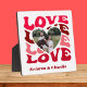 Décor maison pour la Saint Valentin. Célébrez l'amour avec cette plaque carré avec un chevalet, personnalisé avec vos noms ou vos initiales et votre photo de couple préférée sur un design cardiaque avec texte rouge.
