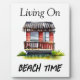 Mur d'art avec une maison de plage à l'aquarelle tropicale plante, avec la citation drôle, "Living on Beach Time". Ai art. génomique